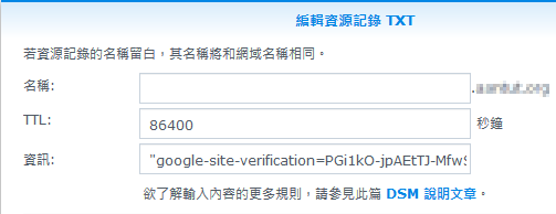 如果DNS設定在自己的伺服器管理,就必須將TXT 紀錄貼在DNS管理中