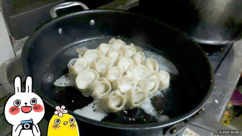 煎鍋(不沾鍋)中放入少許油,再將煎餃放入鍋中排好,再放入約淹至水餃底部的麵粉水少許,蓋上鍋蓋,小火煮等至冒水蒸氣與香味出來後,觀察鍋中水分消失後即可起鍋。