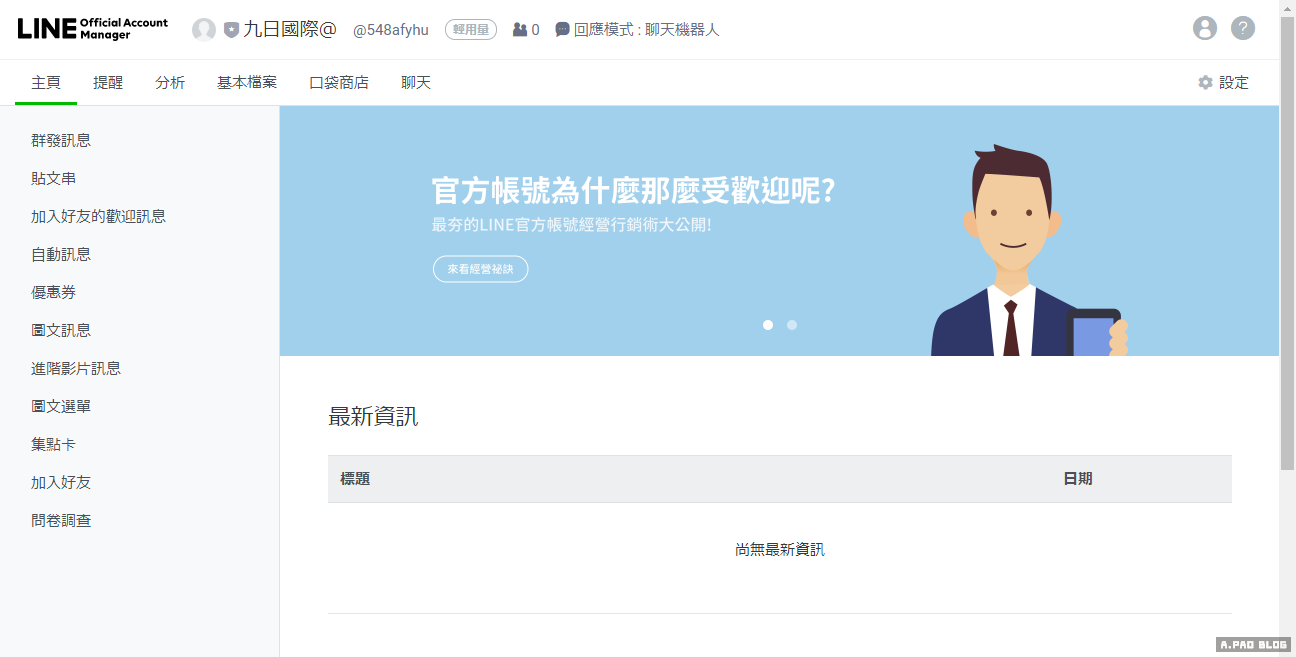 常用的功能:群發訊息(500則)、自動回應訊息(地址、電話、店家地圖等等)、加入好友(QRcode)等等。其他的可以多試試看喔。有空我再寫心得囉。