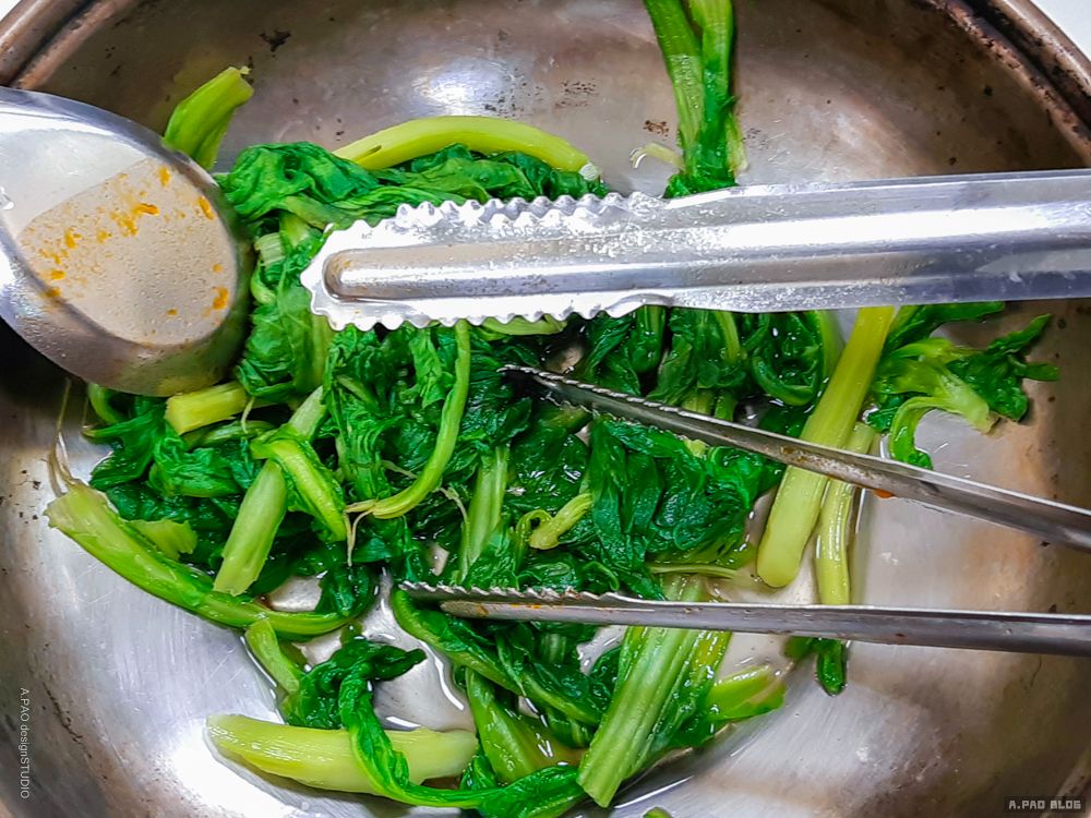 ▼水煮茼蒿,開水中加鹽巴,一方面增加沸點,一方面調味