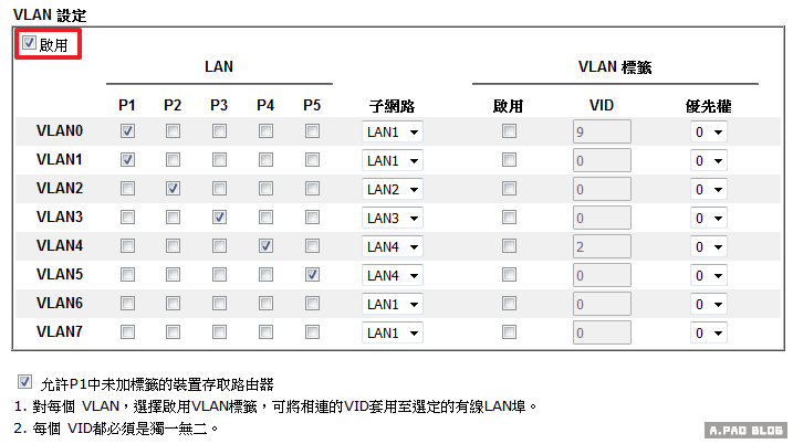 ▼Vigor2925 區域網路 >> VLAN 設定。啟用VALN,並對應實體 LAN port