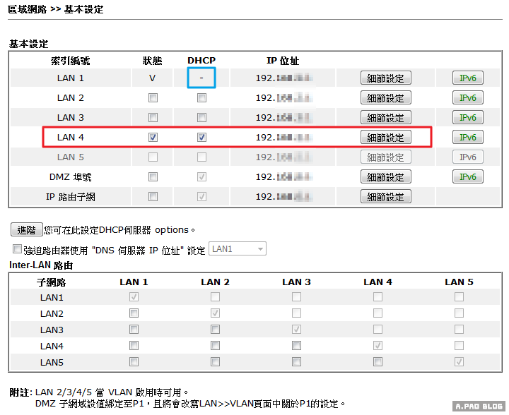 ▼Vigor2925 區域網路 >> 基本設定。開啟需要用到的VALN與網段與關閉實體LAN1的DHCP