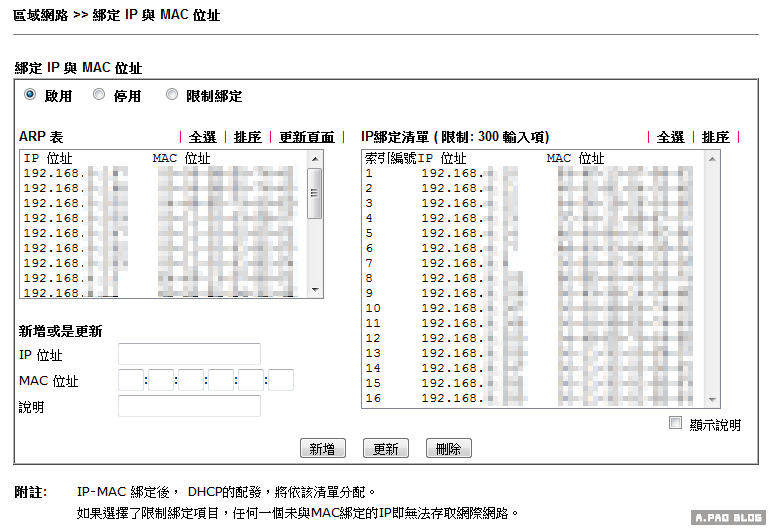 ▼Vigor2925 區域網路 >> 綁定 IP 與 MAC 位址。為了盡量不讓外部使用者進入,使用綁定比較安全