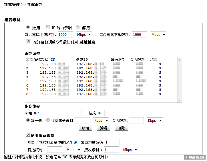 ▼Vigor2925 頻寬管理 >> 頻寬限制。為了防止過度的使用頻寬,在這裡設定頻寬以確保伺服器的頻寬