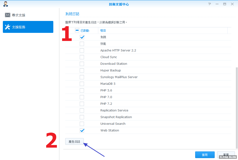 ▼「支援服務」->「系統日誌」->1.勾選「系統」「We Station」選項-> 2.按下「產生日誌」