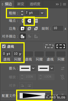 ▼線條→粗細(7pt)→虛線(虛線0pt / 間隙10pt)→配置文件為第四個(也嘗試選擇另外的方式)